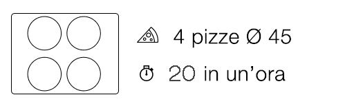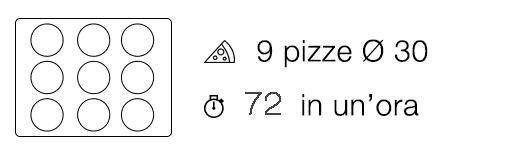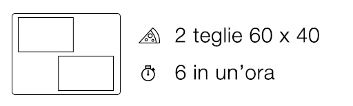 Il modello più grande ti permette di cuocere contemporaneamente 2 teglie di pizza (60×40 cm) oppure 9 pizze da 30 cm di diametro.